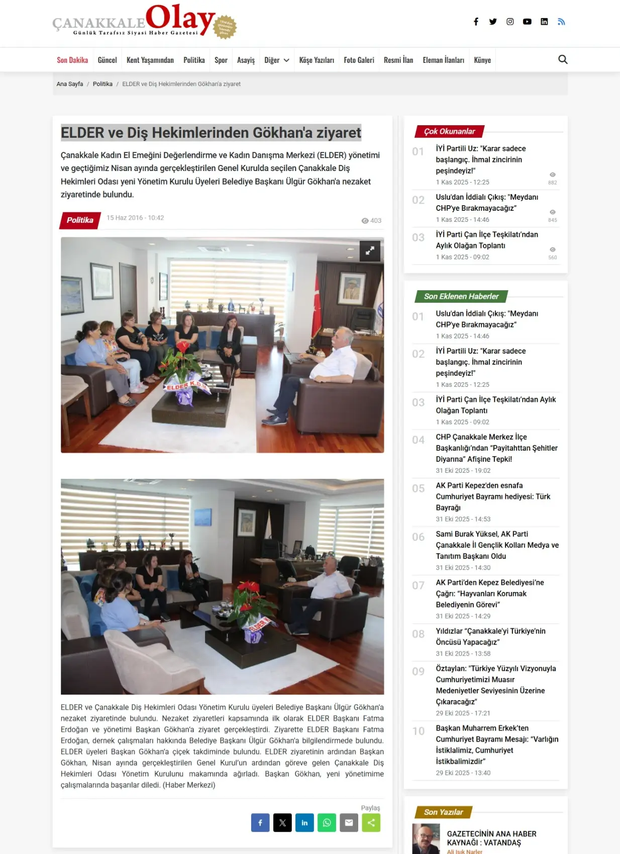 Çanakkale Kadın El Emeğini Değerlendirme ve Kadın Danışma Merkezi (ELDER) yönetimi ve geçtiğimiz Nisan ayında gerçekleştirilen Genel Kurulda seçilen Çanakkale Diş Hekimleri Odası yeni Yönetim Kurulu Üyeleri Belediye Başkanı Ülgür Gökhan’a nezaket ziyaretinde bulundu.