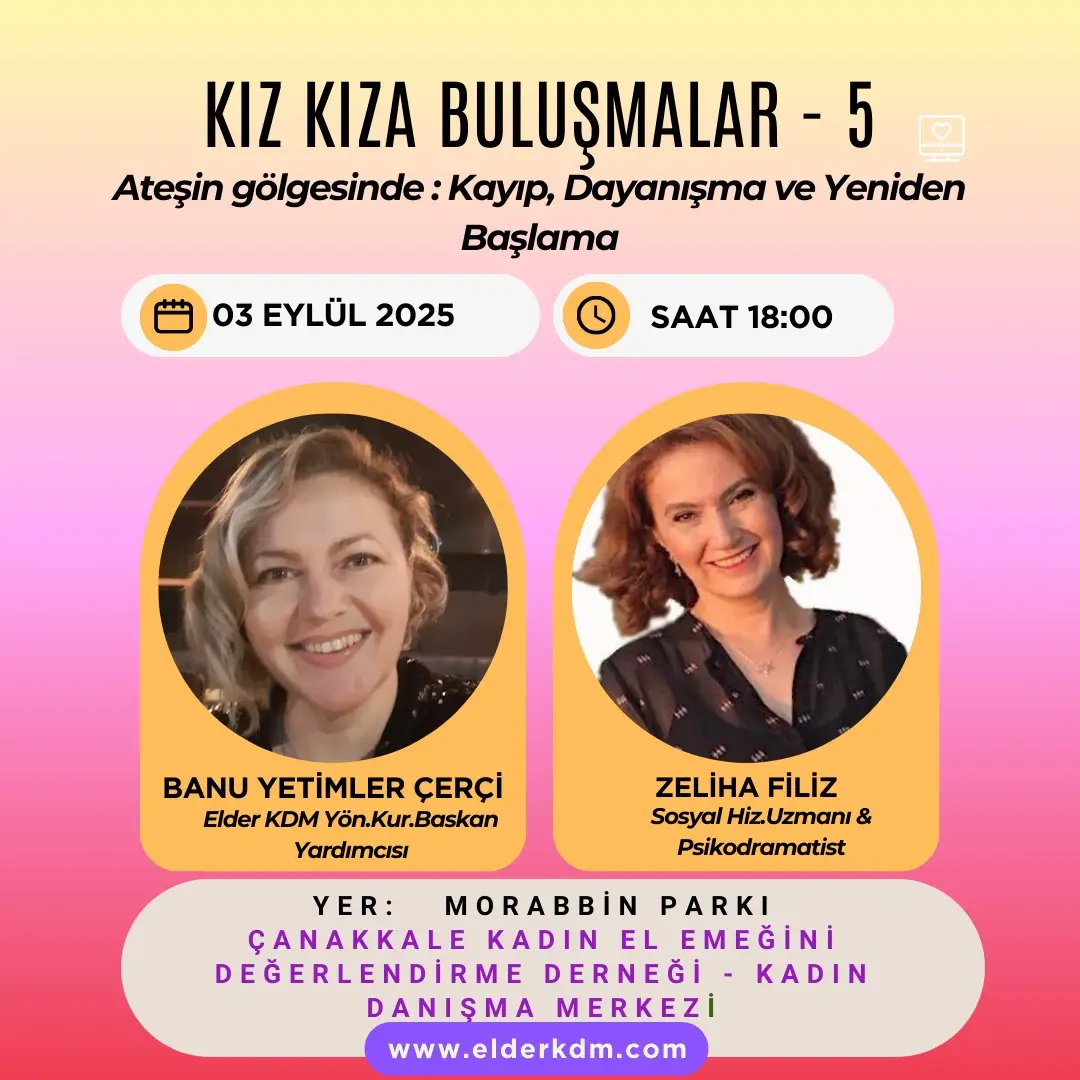 KIZ KIZA BULUŞMALAR – 5 etkinliğimiz “Ateşin Gölgesinde; Kayıp, Dayanışma ve Yeniden Başlama “ temasında 03 Eylül 2025 tarihinde Morabbin parkında yapılmıştır. Söyleşimiz Elder KDM Yönetim Kurulu Başkan Yardımcısı Banu Yetimler Çerçi ve Sosyal Hizmet Uzmanı, Psikodramatist Zeliha Filiz’in katılımıyla ile gerçekleşmiştir.