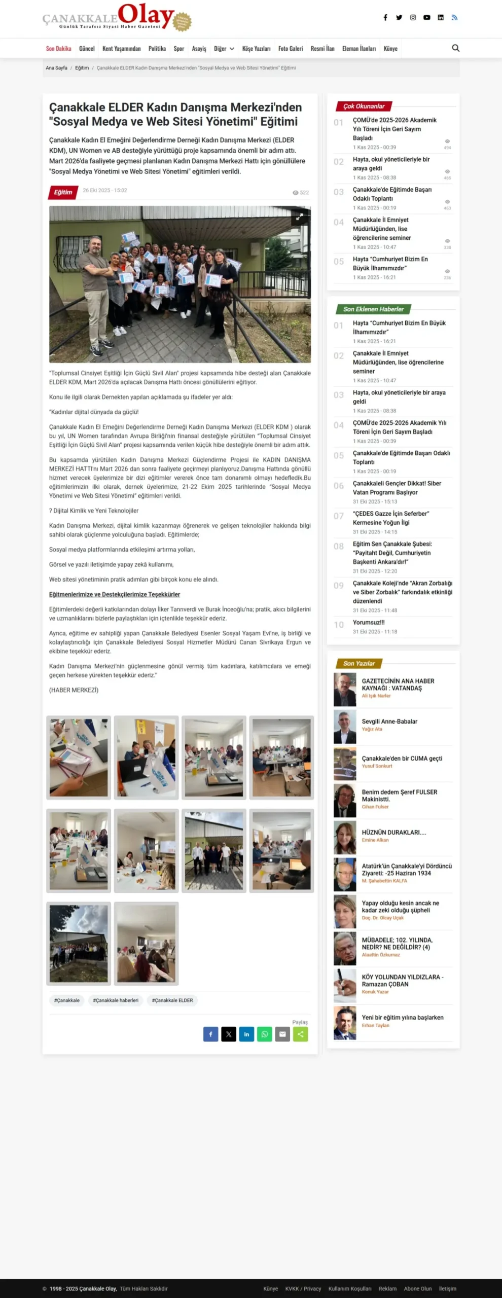 Çanakkale Kadın El Emeğini Değerlendirme Derneği Kadın Danışma Merkezi (ELDER KDM), UN Women ve AB desteğiyle yürüttüğü proje kapsamında önemli bir adım attı. Mart 2026’da faaliyete geçmesi planlanan Kadın Danışma Merkezi Hattı için gönüllülere “Sosyal Medya Yönetimi ve Web Sitesi Yönetimi” eğitimleri verildi.